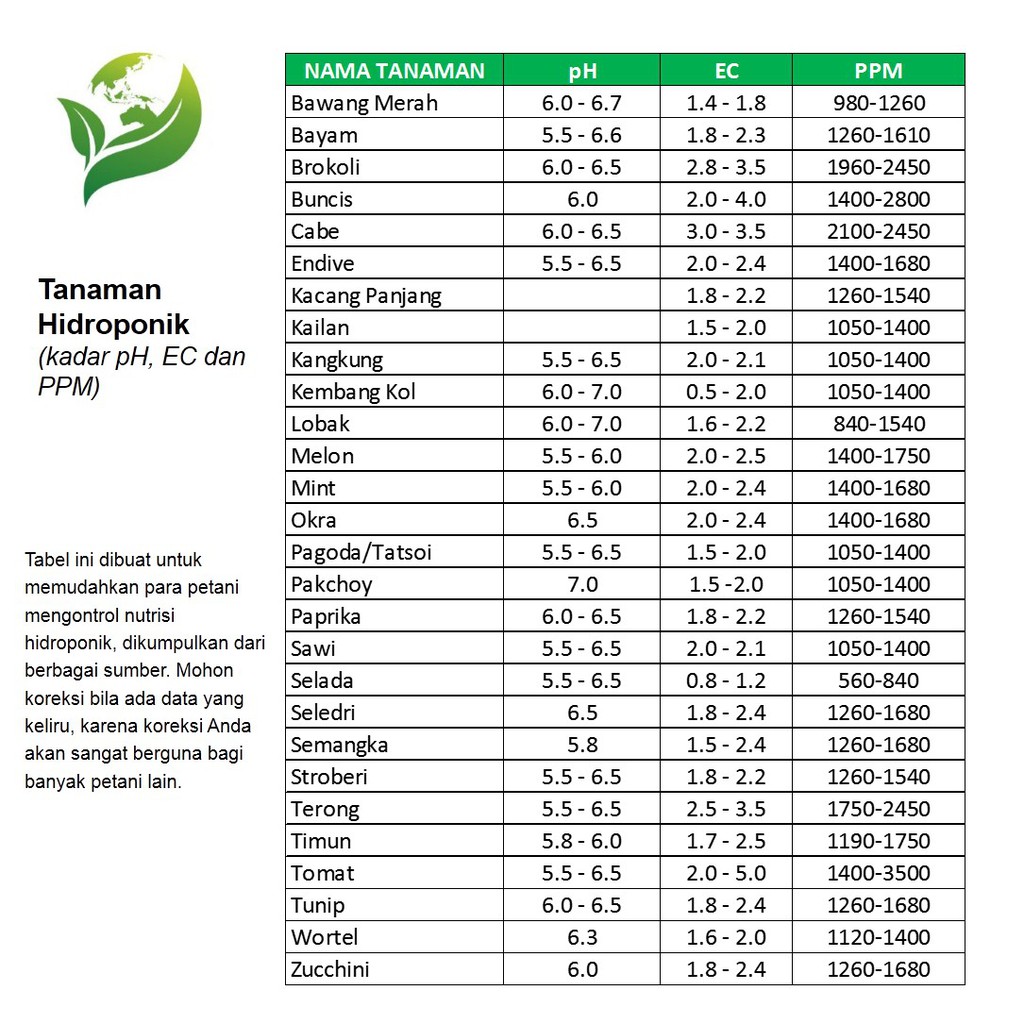 Teknologi Greenhouse dan Hidroponik. List dan Tabel ppm hidroponik Tabel ppm hidroponik untuk berbagai jenis tanaman. EC singkatan dari Electrical Conductivity alat ini digunakan untuk mengukur kepekatan suatu larutan dalam hal ini adalah larutan nutrisi hidroponik.